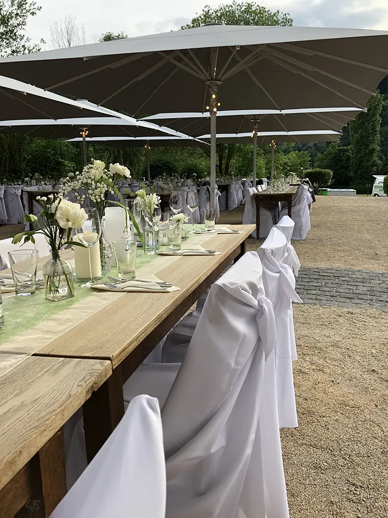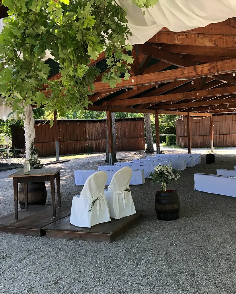 Wir gestalten eure Zeremonie so, wie ihr es wollt, inkl. Bestuhlung, Traubogen, Musik und Sektbar danach. Schlechtwetter? Haben wir als Innenvariante.